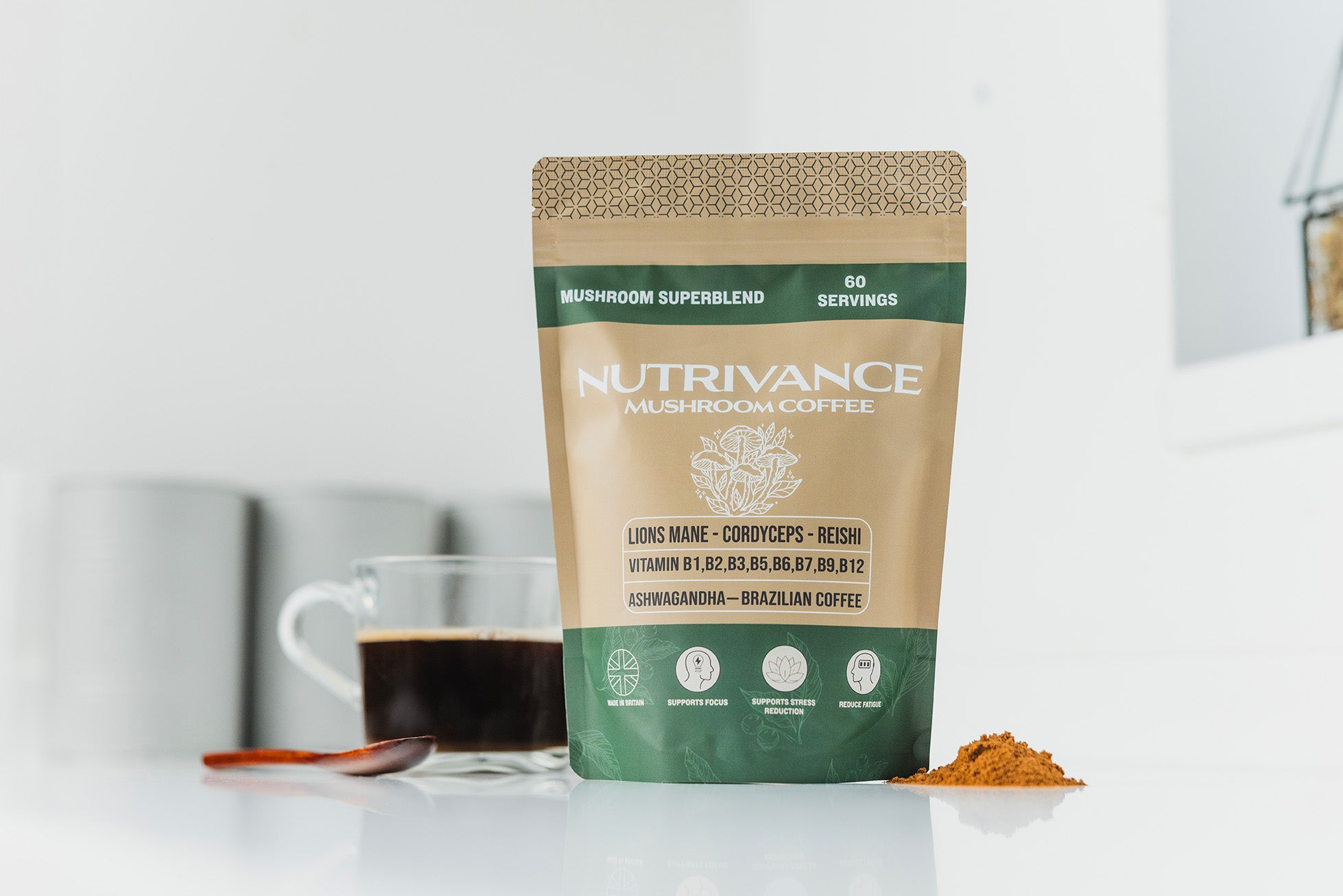 Nutrivance Muushroom Coffee 1200mg of Lions Mane Cordyceps Reishi Ashwagandha B Vitamins Premium Arabica Brazilian Coffee